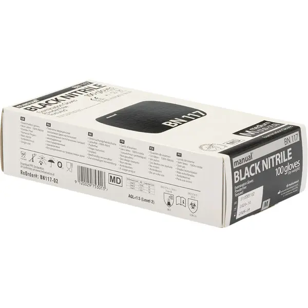 Latexfreier, puderfreier und unsteriler Untersuchungshandschuh. Material: Nitril (Acrylonitril-Butadien). Design und Merkmale: Beidhändig verwendbar, gerade Finger, texturierte Oberfläche an den Fingerspitzen, Rollrand. Farbe schwarz. Puder: <2mg/Handschuh (puderfrei).